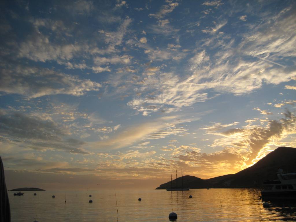 On Tuesday, after two nights of rolling waves, we decided to move off the anchor back into Isthmus Cove moorings. The weather changed to cloudy skies, warm and really humid. After dark we got a big suprise, a weather squall moved through the Isthmus and created 40+ mph winds for about 10 minutes, followed by a light rain. This was amplified by the Isthmus, which funels the wind from one side of the island to the other. We did the weather dance and ran around the boat getting everything tied down and stowed the bimini. We ended up fine with no damage, but a neighboring 49′ sailboat dragged its mooring over 15 feet and collided with another boat. Wednesday morning the sunrise was beautiful. I tried to capture it with a photo, but this doesn’t even begin to do it justice.