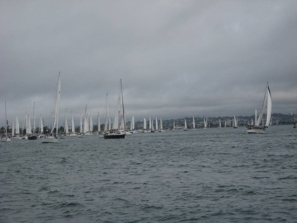 On 10-25-10 (Monday), we started the first leg of the Baja Ha-Ha Rally with 154 other sailboats. The Fleet paraded through San Diego Bay to a starting line between Shelter Island and a Committee Boat, which had dignitaries from both the US and Mexico on board. As we passed the Committee Boat, local Police and Fire Boats sprayed water arches and there was large media presence. Using the same shotgun that started the America’s Cup Races, the rally started at 1100 hrs PDT.