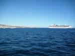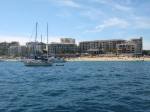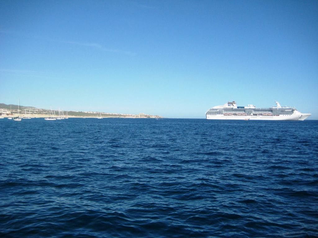 Today, we left the Marina and moved to the anchorage, just East of the the entrance to Cabo San Lucas Marina. We are anchored about 1/2 mile off shore in 50 feet of water. We are now one of those sailboats you look at from the beach while you’re on vacation…