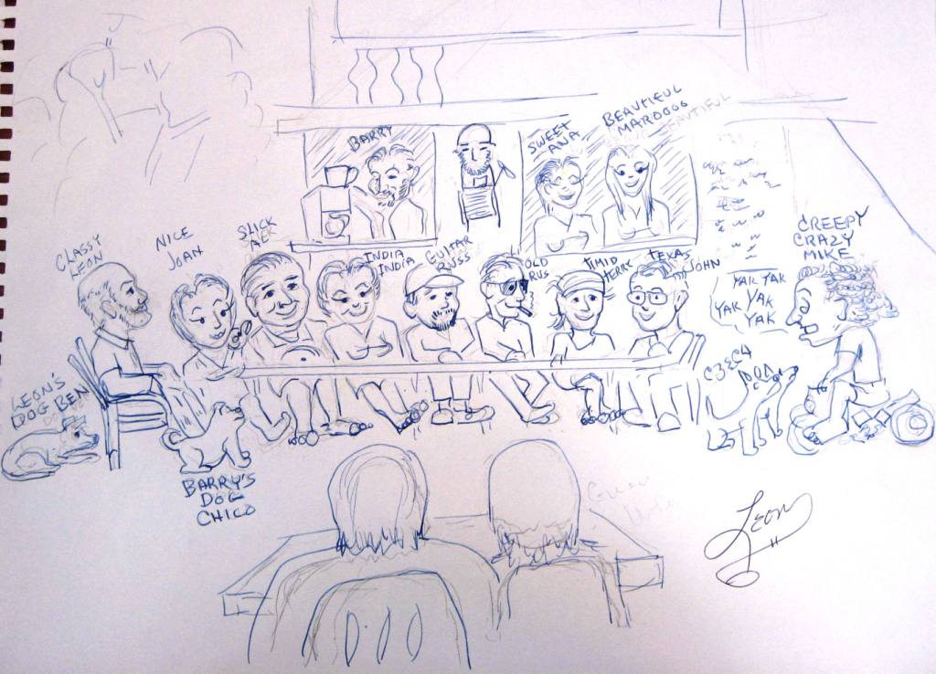 I can’t believe 2 weeks have passed since we arrived in La Cruz! We’re getting ready to leave today and it seems only natural to go for one last breakfast at Ana Banana’s, to say goodbye to our friends. Once there, we’re presented with a gift by Leon – talented and versatile musician, artist and overall exceedingly nice guy. Leon drew a cartoon picture of all the characters we met during our stay -dogs included- and we are thrilled, appreciative and really touched by his thought. Needless to say, we’re hunting for an appropriate frame and picking the best spot to hang it on Camelot.