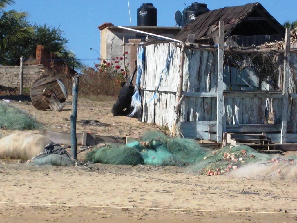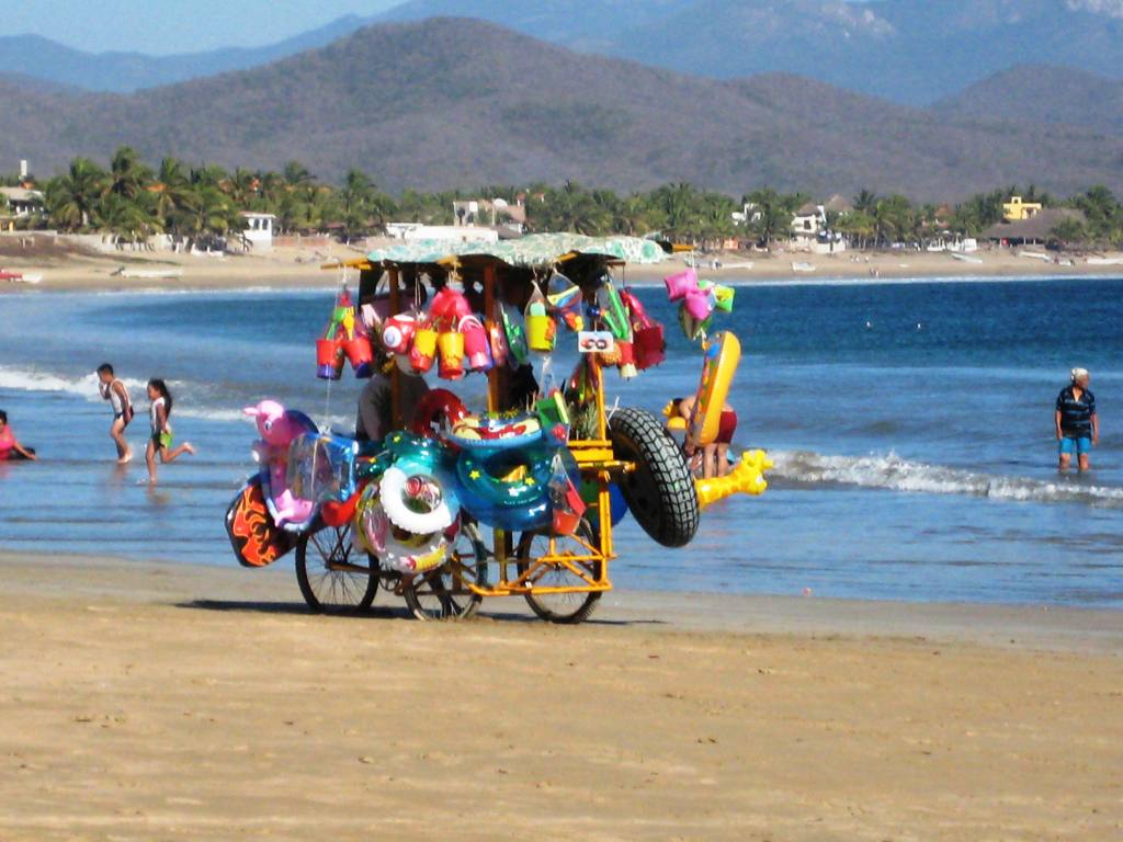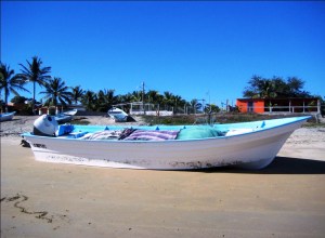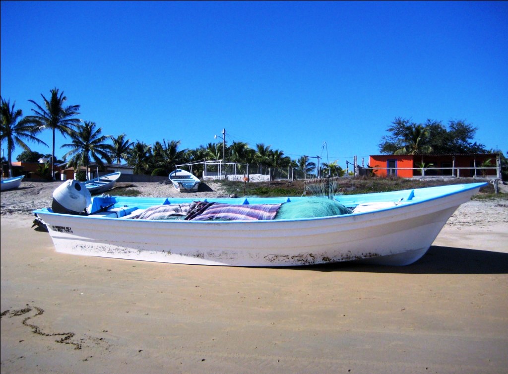 Anyway, over beers and fish tacos we catch up, share our plans, and generally relax. After a while, Tom and I decide to go explore the town behind the beach. It’s called Perula, and there isn’t much to explore, really: the main street, a few tiny stores with smiling people inside, and a plaza. There’s almost no one around, it is Sunday after all and whoever is around would be on the beach, I think. So back to the beach we go, strolling lazily and taking in the view, the colors, the happy kids running around, the gossiping elderly ladies laying completely dressed in the shallow water, the mounds of fishing nets laying in wait.