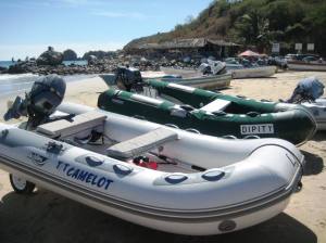 A word on our means of transportation once in the anchorage: like all cruisers, we travel on our dinghy, a small inflatable boat with a hard fiberglass bottom, about 11 feet long, powered by a 15 hp outboard engine. It’s our car, for lack of a better comparison. It even has 2 wheels! The wheels are deployed for beach-landings. Landing your dinghy on a beach is no small feat. It requires careful watching and timing of the waves hitting the shore to ensure a smooth landing and to avoid getting soaked or tossed in the water, which is extremely embarrassing (not to mention uncomfortable), especially in front of crowded places…
