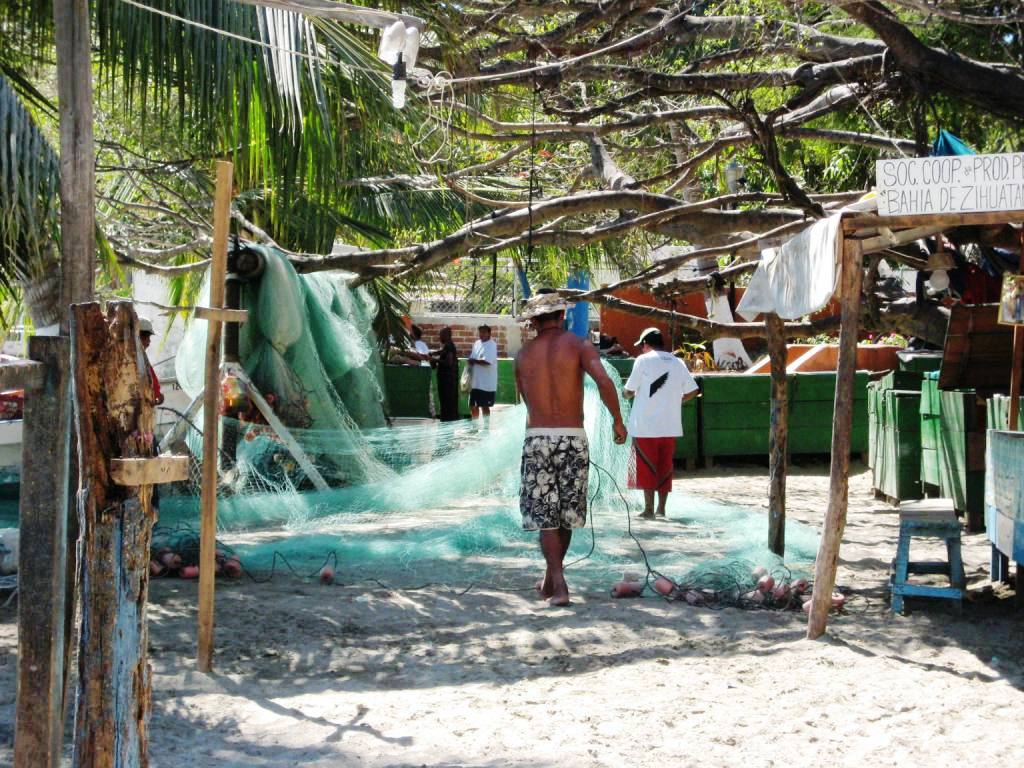 My husband has a way with people that I envy. Early one morning while having coffee in the cockpit he noticed a Panga (fishing boat) with five fishermen aboard, intent on tossing their net right under our boat (there was a huge presence of sardines enjoying the shady spot under Camelot’s hull). After a few minutes observing the men working, Tom greeted them with his booming, friendly voice offering them freshly brewed coffee. The fishermen were surprised, maybe they didn’t understand right away, but in the end they got the meaning of Tom’s pointing at his supersized coffee mug and they shyly accepted. So we poured them coffee in big foam cups, they thanked us with big grins and left to go fish in the open sea. The sardines caught with the net were to be the bait for the day.
