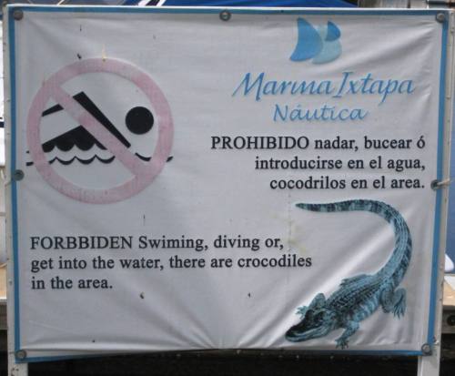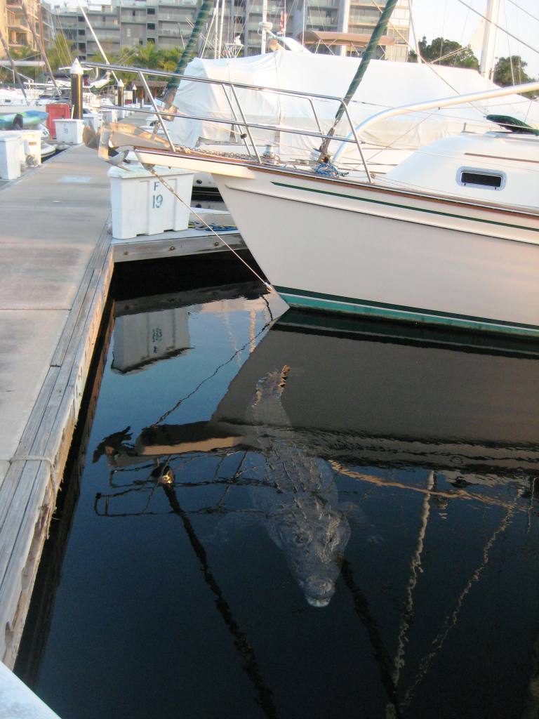 The “on the dock” entertainment consists mainly of the visiting resident crocodiles. Yes, there are a few crocodiles IN the Marina and they come around the boats at dusk, swimming in the empty slips, eyeing the tasty-looking humans. I noticed only ONE cat in the neighborhood, no dogs. It is strongly recommended to keep small children and pets in your arms while walking the docks… I’m mildly concerned and ready to run for cover as I observe our visitor, but can’t stay away from Pancho (that’s his name).