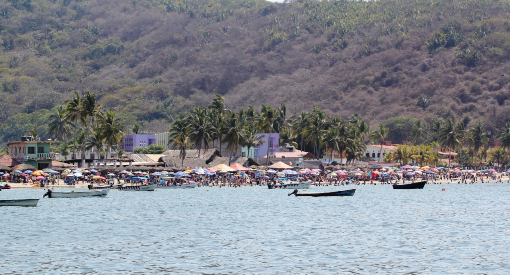 A panga comes to visit us and in the usual mixed Spanglish we communicate with our smiling visitors. They want to know where we come from, how long it took us to get here, how many days of travel, how many miles. It turns out everybody thinks we came straight from San Francisco to Jaltemba! We had a fun time explaining our wandering ways to these friendly people. Their faces fell into a frown when they learned that we were going back to Banderas Bay the next day, and they made us promise to stop again on our way back and spend time in the bay they’re so proud of.