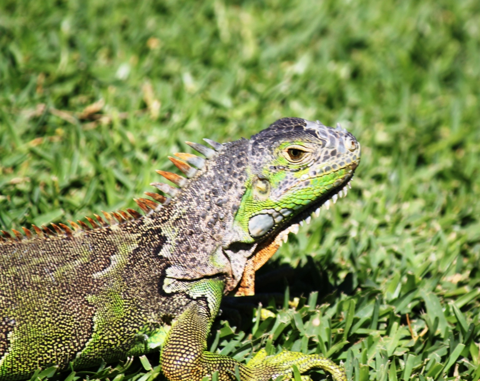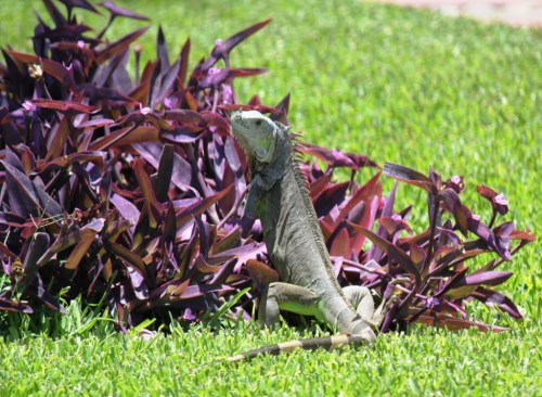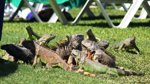 We’re amiably chatting with vacationing people and residents alike. One of the residents, Earl, comes by the pool every afternoon around 15:00 armed with a bagful of lettuce, tomatoes, fruit and bread. He sits in a corner and is instantly swarmed by at least 30 Iguanas of various sizes and ages, all eagerly awaiting his treats. Just like dogs, but much better behaved!