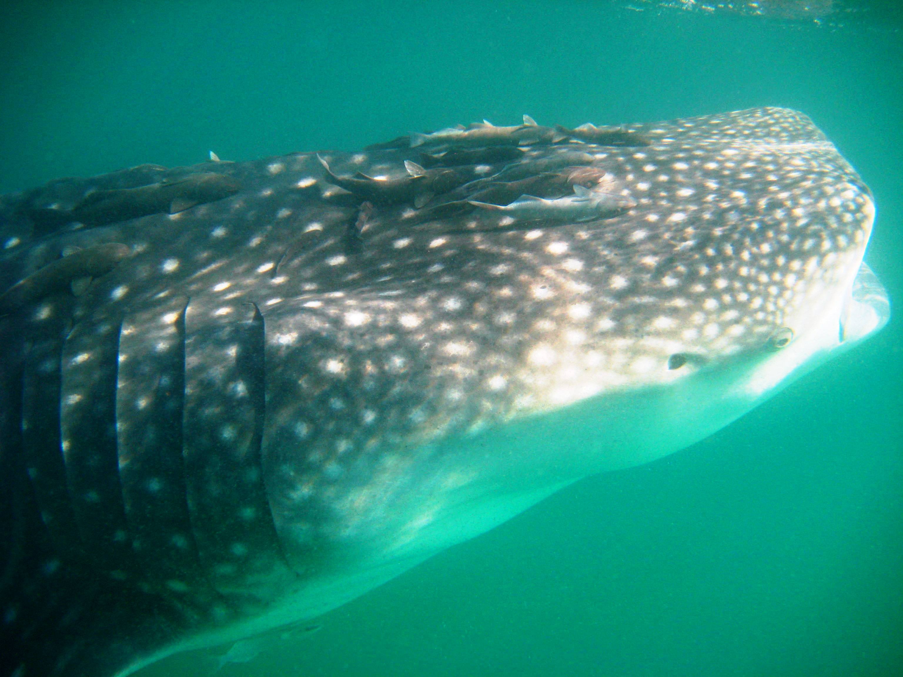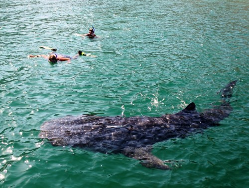 Immediately upon sighting, Tom grabbed his fins and mask and hastily dove after the shark. I have to say, it was really funny seeing Tom trying to put his mask on over his sunglasses, which he forgot he had on in all the excitement… So off he went, fearlessly diving underwater to get some prime shots of this puppy Whale Shark.