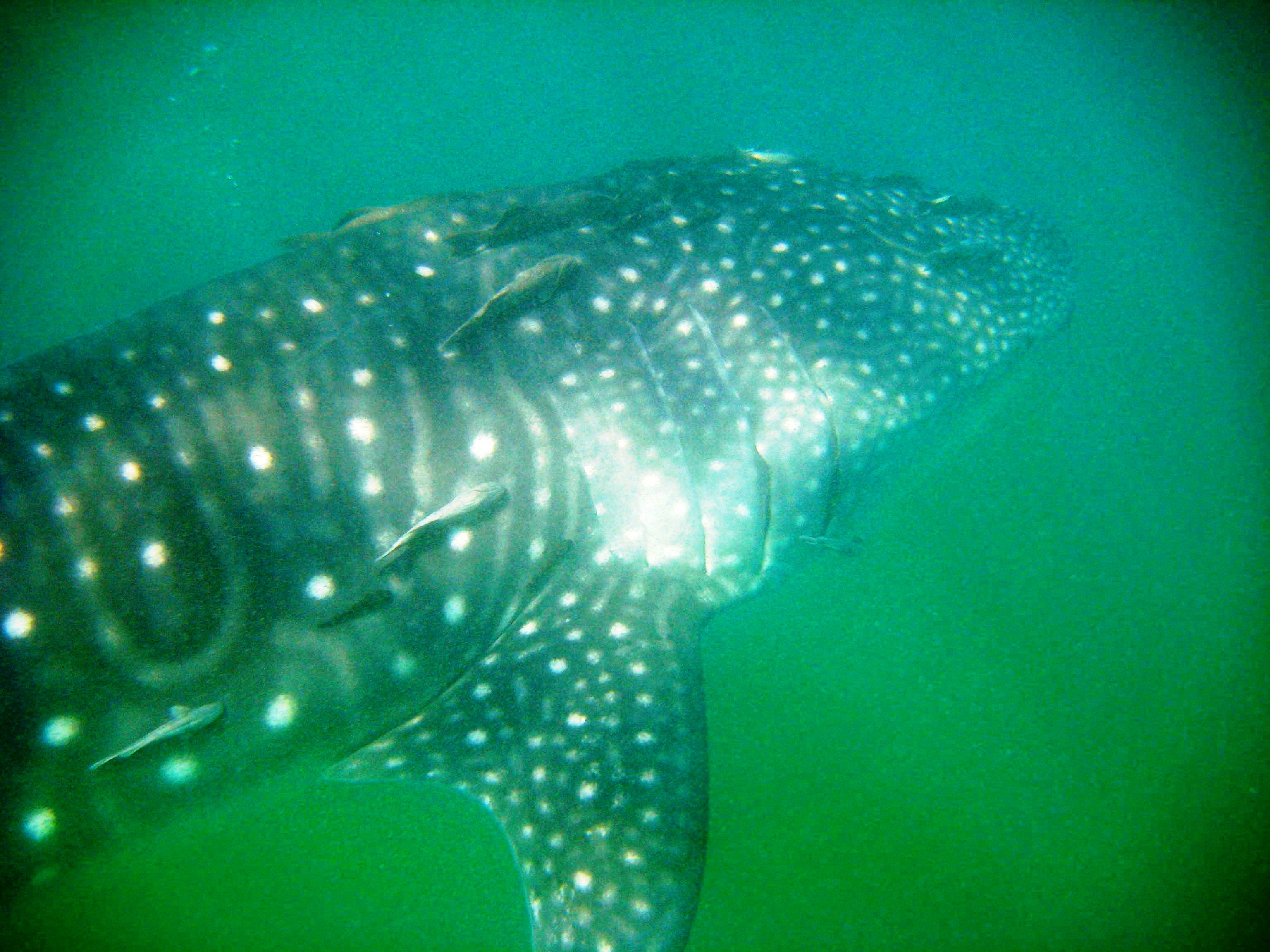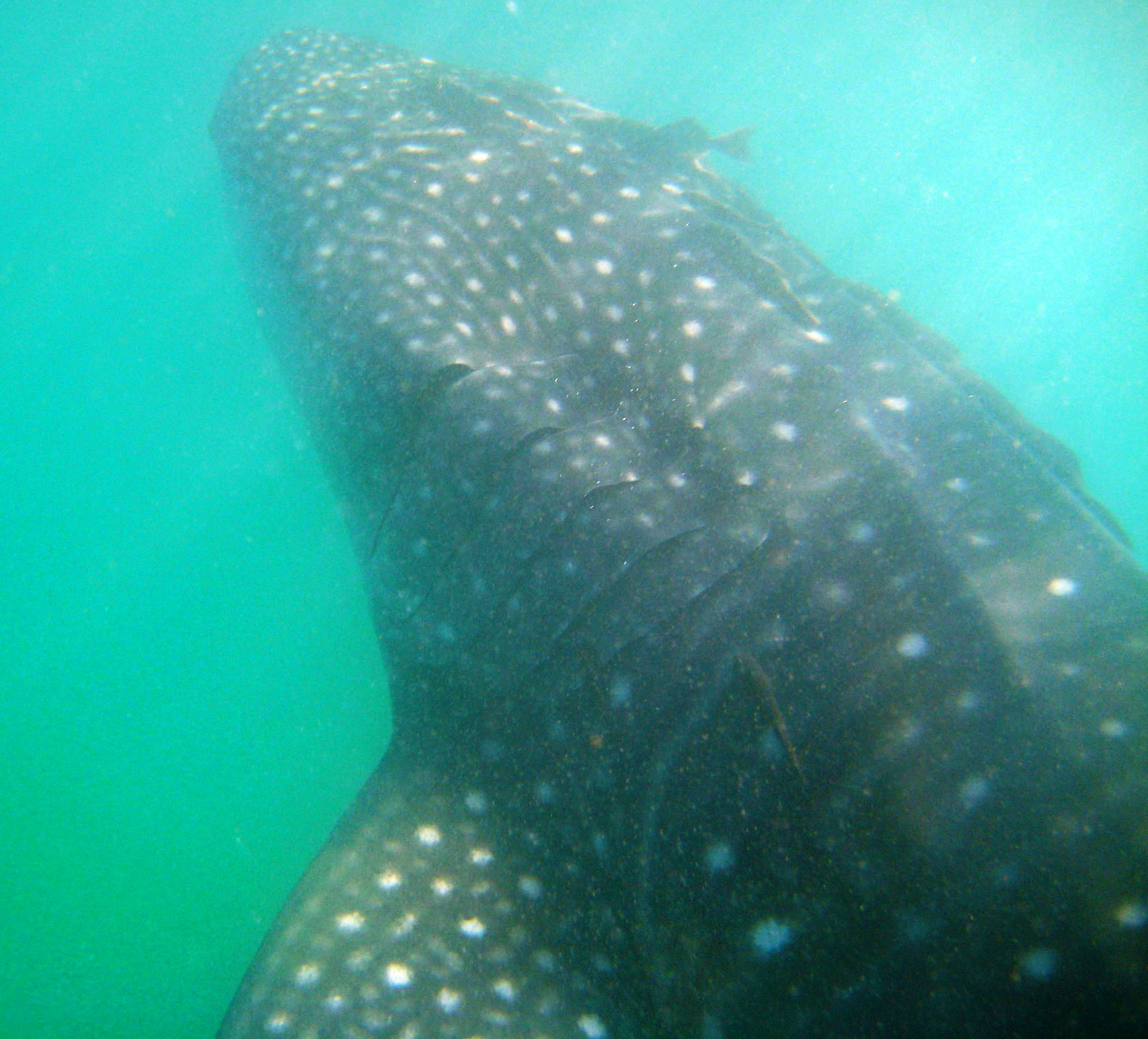 Tom’s lifelong wish to swim with the Whale Sharks has been granted . One late afternoon a young and curious specimen came wandering in the bay, lazily spinning circles around Camelot and other neighboring boats. He swam close to the surface, and REALLY close to our boat.