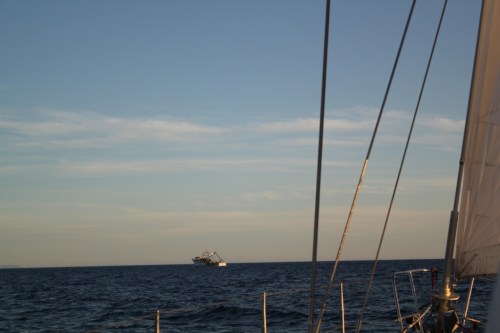 At around 8 o’clock peace is disrupted; the wind starts to blow, the sea builds up. Well, good morning to you, too, Mother Nature! Cranky, today, are we… So much for the weather forecast that predicted no wind… Where did this monster-wind come from??? At the first sign of breeze Tom had already raised the mainsail and we’re now unleashing the headsail, trying to harness in all the wind power we can. Soon we’re slashing through the sea at 8.2 knots, a more than respectable speed for our fat-bellied, overloaded Camelot.