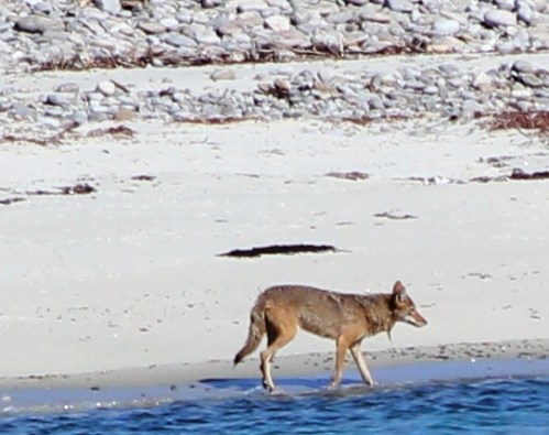 The next morning, as we sip our coffee and stare at the beach, we notice a lone coyote walking the whole length of the small bay, occasionally stopping and sniffing the air, the ground, even the water. How strange! But it is desert terrain out there, and we did hear them yelp and howl late into the night. I’ve never seen a coyote before, much less on a beach!