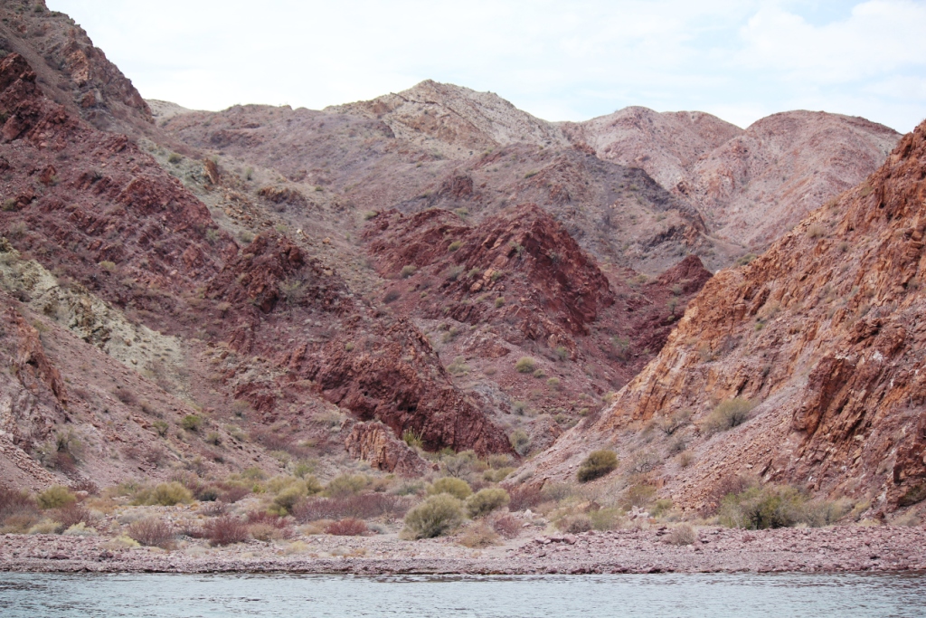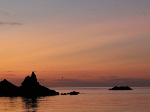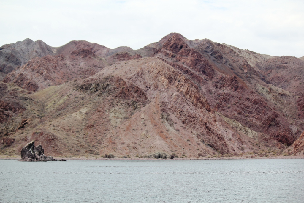 We’re the only “tenants”, so we pick the best spot, right in front of a colorful canyon. The imposing Sierra Agua de Soda range (Soda Water Mountains) towers over the anchorage with its characteristic antique-rose color, providing a great backdrop against the emerald green waters. There are a few rocky islets on each side of the cove and a number of birds flying about. Yes, another corner of Paradise.