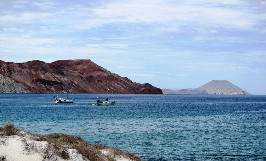 We get there and make ourselves at home in less than an hour. There are only two other sailboats anchored in this spacious bay. I’m happy to see that there’s a nice stretch of white sand beach, an expand of desert beyond the beach, a few spectacular little coves hidden in the rugged rocks, and a multitude of birds. Perfect!