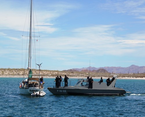 There are three other sailboats close to ours; by the time we reach Camelot the Navy guys are already boarding one of our neighbors, their expression unreadable. We observe them, trying not to be too obvious about it, waiting for our turn. They must be conducting a pretty thorough search, as it takes them about half an hour to finally come to us. Tom is on deck, friendly as usual, welcoming them to our boat. The boarding maneuver is interesting and a little hair-raising. The pilot, a stern looking guy in aviator mirror sunglasses, points the bow of their boat directly on Camelot starboard side. I’m wondering if he intends to T-Bone us… With great skill he hovers at about an inch from our boat’s hull, allowing the inspecting official and his assistant to effortlessly step aboard.