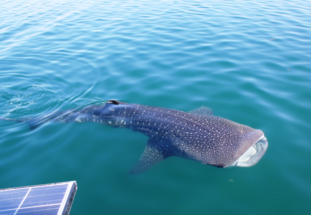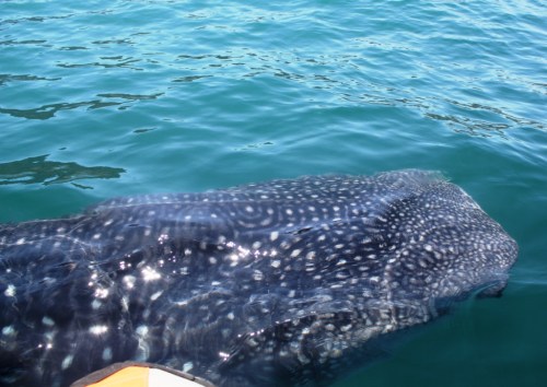 Sunday is spent swimming with the Whale Sharks again, as they are just hanging out close to our boat. There are three of them; the biggest is the most curious, ogling Tom at an angle as they swim together.