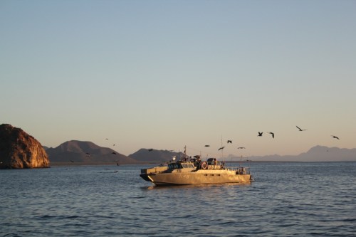 Tom is certain that we’ll be boarded (again!), so we sit in the cockpit sipping coffee and waiting patiently. Quite a few minutes go by; Tom is closely watching every move of the guys on deck. Finally he can’t take it anymore, so he hollers “Hola, Amigos! Coffee?”, lifting his own coffee mug to make his point. Bless my husband, building a bridge of friendship made of coffee wherever we go. This time, possibly for the first time in Mexico, his offer is politely declined. As it turns out, the Mexican Marines have stopped in this quiet bay just to take a break and have a peaceful breakfast. No boarding, no questions, just a little waving. It’s always reassuring to see these guys around.