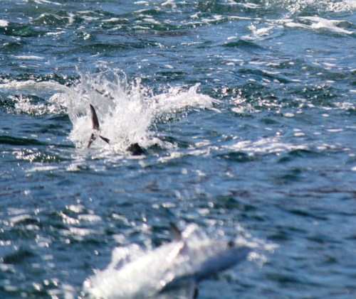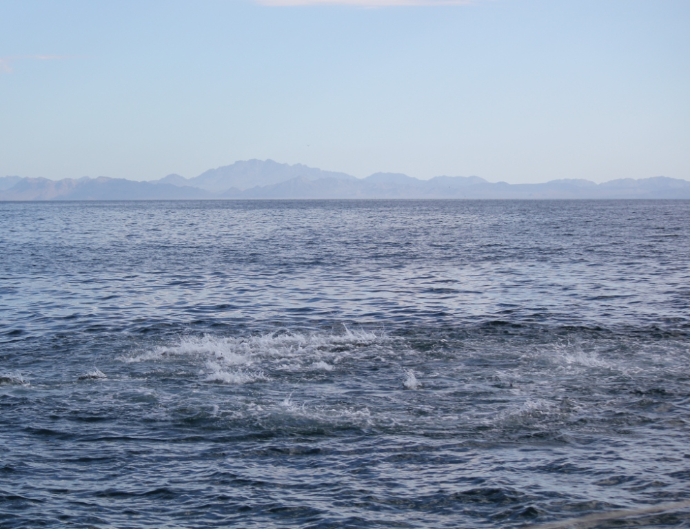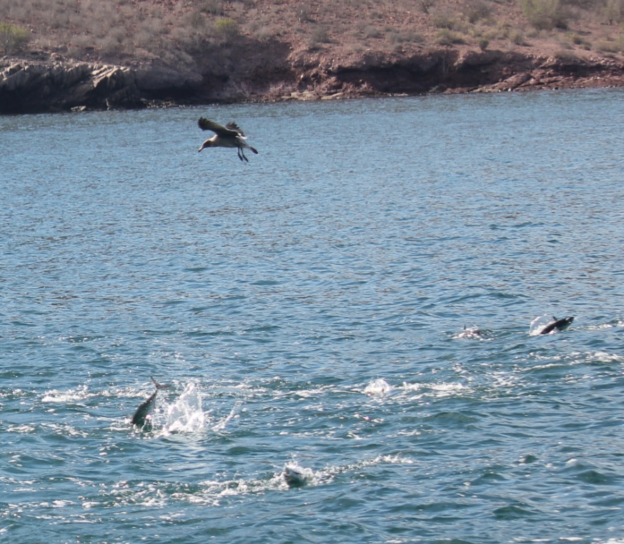 I’m half expecting some Sea Monster to come out; instead we determine the disturbance to be caused by numerous middle-sized fish, all apparently intent on feeding. This goes on for hours at a time, multiple times a day. The pelicans are ecstatic… I’m wondering if any of these creatures will be bold enough to jump up into the boat…