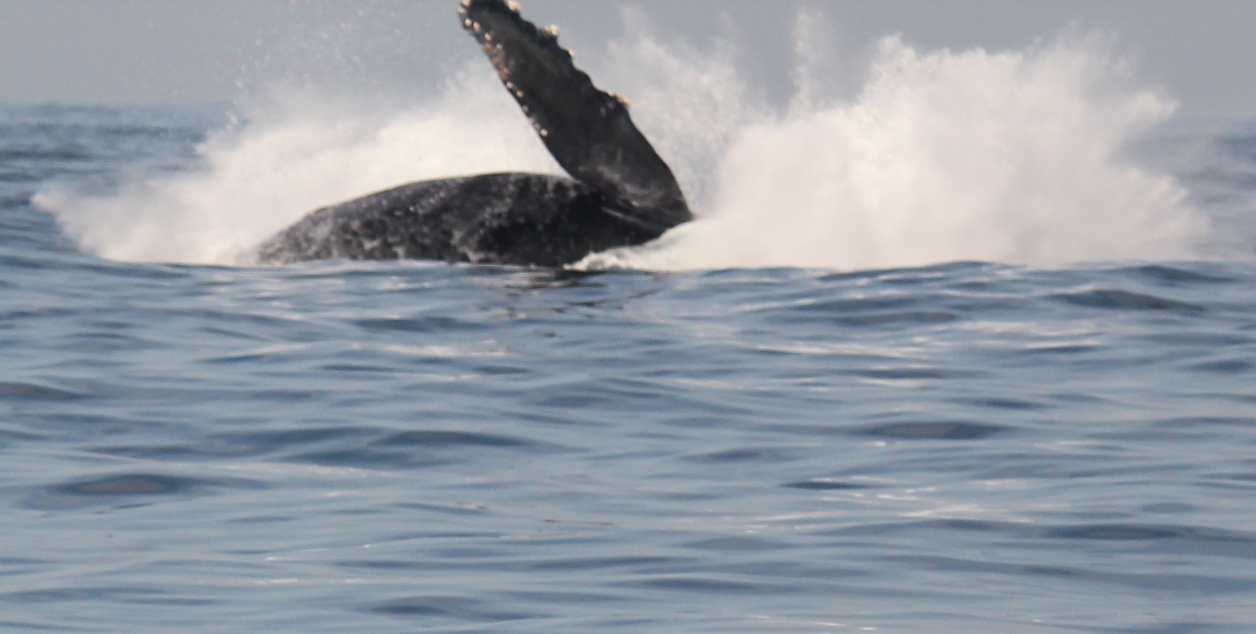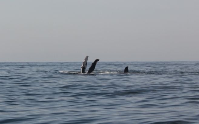 We don’t have to wait long at all. We’ve just finished eating breakfast when I see something sticking out of the water in the distance. Sure enough, on the starboard side about half a mile from us there’s a couple of whales frolicking in the water. I fumble for my camera: better get ready in case they come closer.