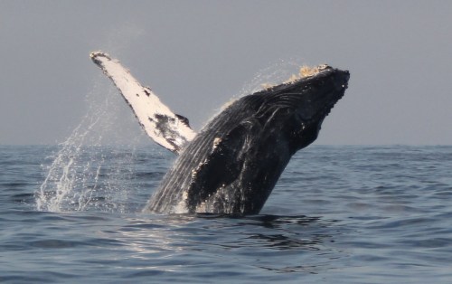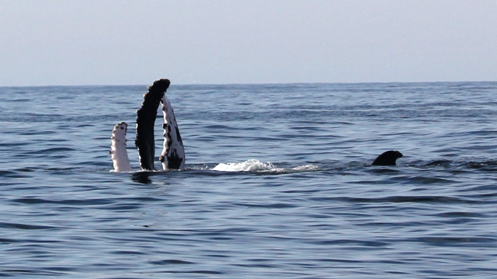 Some instinct tells me to look ahead instead, and wherever that came from I’m really grateful: right in front of our bow, no farther than 300 yards, I spot a tiny dorsal fin and two huge pectoral fins sticking out of the water. It’s a Mama Humpback Whale lying on her back with her calf swimming above her belly.