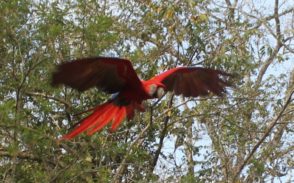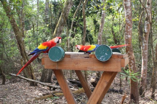 There’s a huge cage where sick birds are taken care of and released when restored to health. I witness one big colorful bird flying about in the wild but retuning to the cage every few minutes, hanging on the metallic net and calling to his mate, inside recuperating from a broken wing. These birds mate for life!