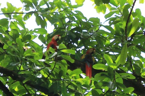 I finally get to see Scarlet Macaws flying in pairs overhead. I hear them long before I see them, as they are noisily bickering with each other, even mid-flight!