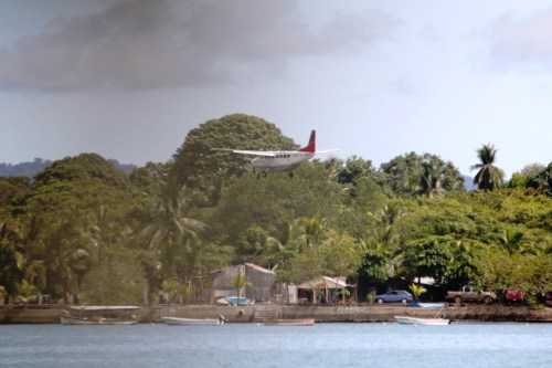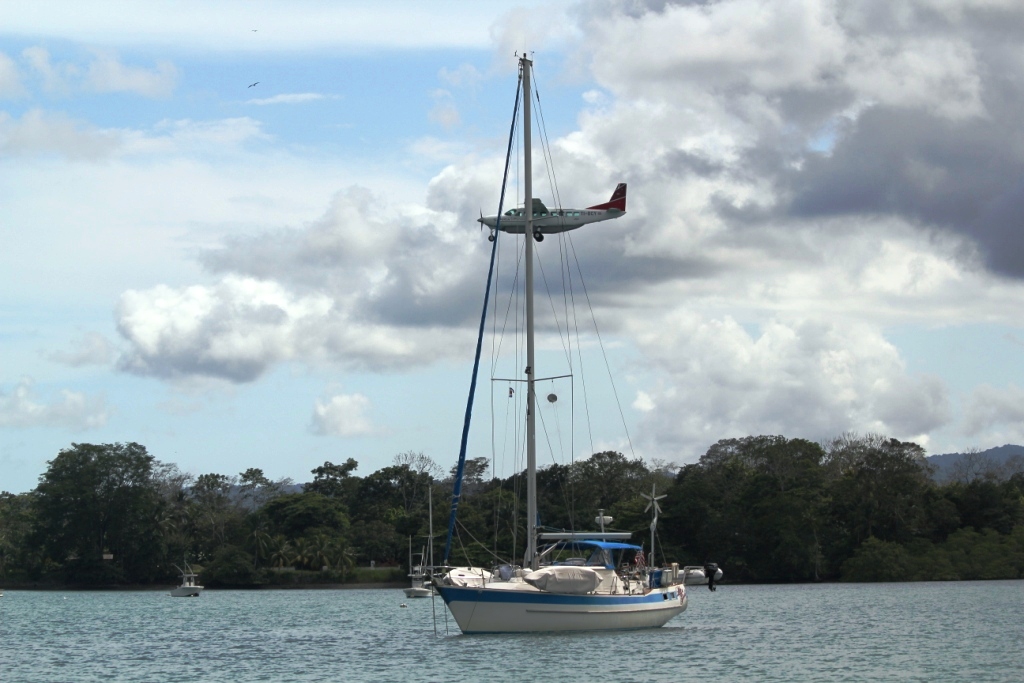 We just happen to be anchored in front of it, apparently separated merely by a small copse of palm trees, judging by the proximity of the small “puddle-jumper” planes zipping by … Needless to say, watching take-offs and landings becomes my favorite pasttime.