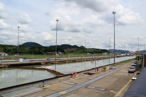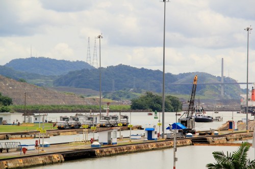 Once at the lock we position ourselves to watch a couple of huge cargo ships followed by a small sailboat in the process of entering the first of the three locks. Quite exciting!