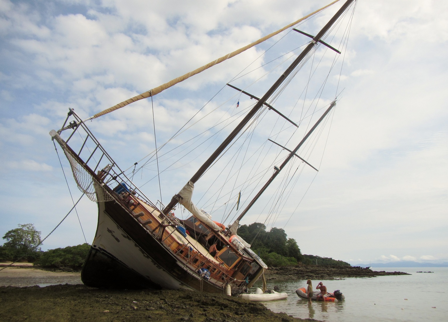 We get on with our day, snorkeling one of the reefs, spending a lot of time in the water and forgetting all about the Loud Sailboat. But when we return a couple of hours later we clearly see the boat leaning at an unhealthy angle: the tide is going down and they must be touching bottom. But they seem to be okay, cleaning the exposed bottom of the hull -a common technique called careening-. Strange place to be doing that, you usually choose a sandy spot, not a rocky one…