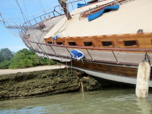 The next day, the saga of the Loud Sailboat takes an unexpected turn. They move from their anchoring spot to another one opposite us and closer to Mogo Mogo beach, in very shallow waters. Tom comments about the extreme tides in this place, wondering if they know that in a few hours the water will go down about 16 feet, leaving them on a bed of coral reef… Oh, c’mon, the MUST know, the water is crystal clear and the reef clearly visible!