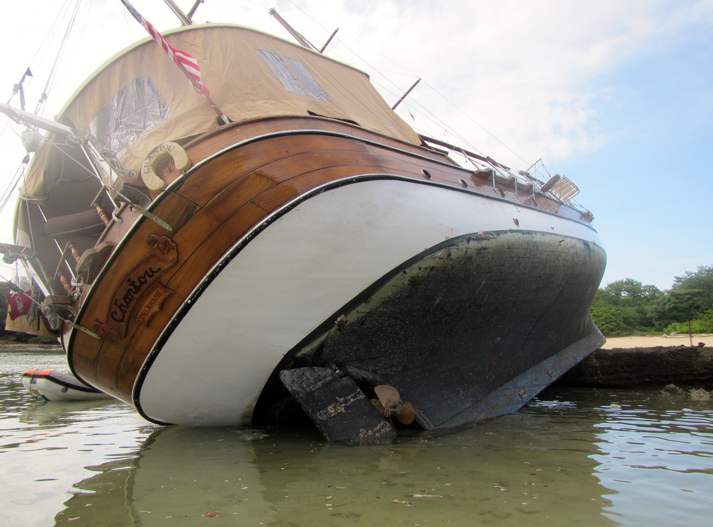 The boat’s name is Chantou, hailing from Emeryville, California. She’s a true beauty and it breaks my heart to see her like this. I hope they can get her up and to safety before it’s too late.