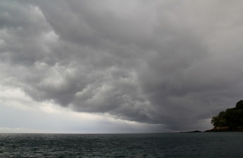 The weather quickly changes, dark clouds promising a good thunderstorm and lightning, the sea getting choppier by the minute. We won’t be paddling our dinghy ashore today!