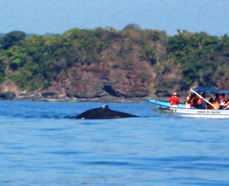 After a couple of close calls we start to relax, the fishing boats are fading away. Coffee in hand and grins on our faces, we peacefully take in the beauty surrounding us. All around the boat small manta rays are jumping a couple of feet out of the water, noisily landing on their white bellies. Ouch, that most hurt… I see a large black fin at water level not more than 40 feet from our side and point it out to Tom. “Jees, honey, that’s the biggest dolphin I’ve ever seen!”. Of course Tom immediately realizes that it’s not a dolphin we’re looking at, but a baby Humpback whale… And the frantic outlook begins, as I keep mumbling “where’s your Mama? WHERE IS YOUR MAMA???”. We reduce speed, just in case. Within a 200 feet radius we start seeing Mama Whales with their babies on their side, swimming slowly in front of us, behind us, to our sides… I count 5 sets of them. We’re surrounded! Tom gets all excited and runs to the bow, camera in hand, hoping to get a few good pictures of this incredible sight. I am more thinking of how I might need a diaper as I nervously grip the wheel… In any case, with some care we manage to proceed safely, escorted by whales.