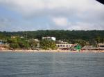 We make our way to the crowded beach and take a long walk from one end to the other, all the way down to a simple but beautiful hotel with gorgeous gardens. The beach is surrounded by lush hills; there are quite a few mango groves on the hills, fighting for space with palm trees. The shades of brilliant green are incredible.